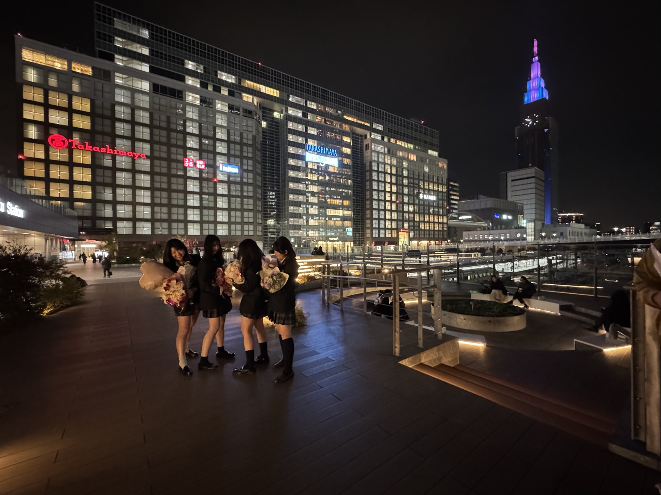 高島屋背景に卒業を祝う高校生 新宿夜景が映えスポットに
