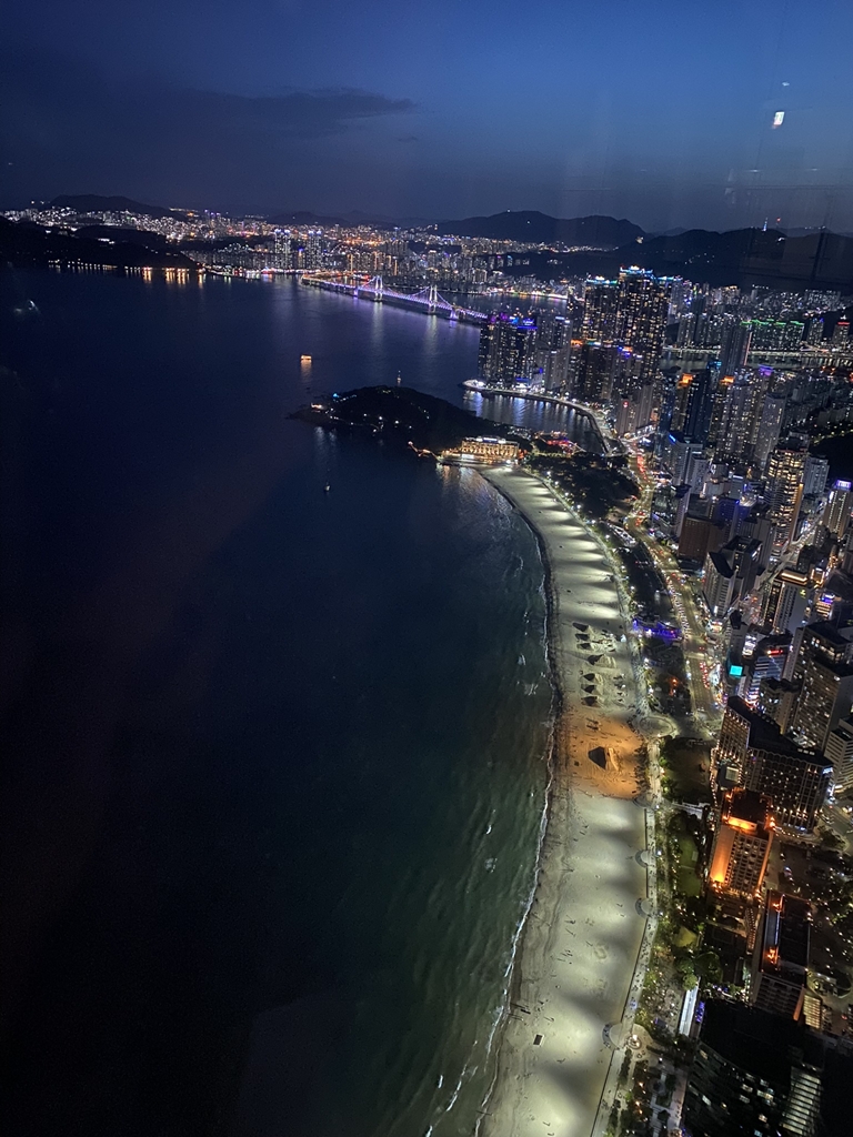 海雲台ビーチの東端に作られた“Busan X the Sky”の100 階展望フロアから臨む。眼下に海雲台ビーチ、奥には広安里沖に架かる広安大橋の夜景が広がる。